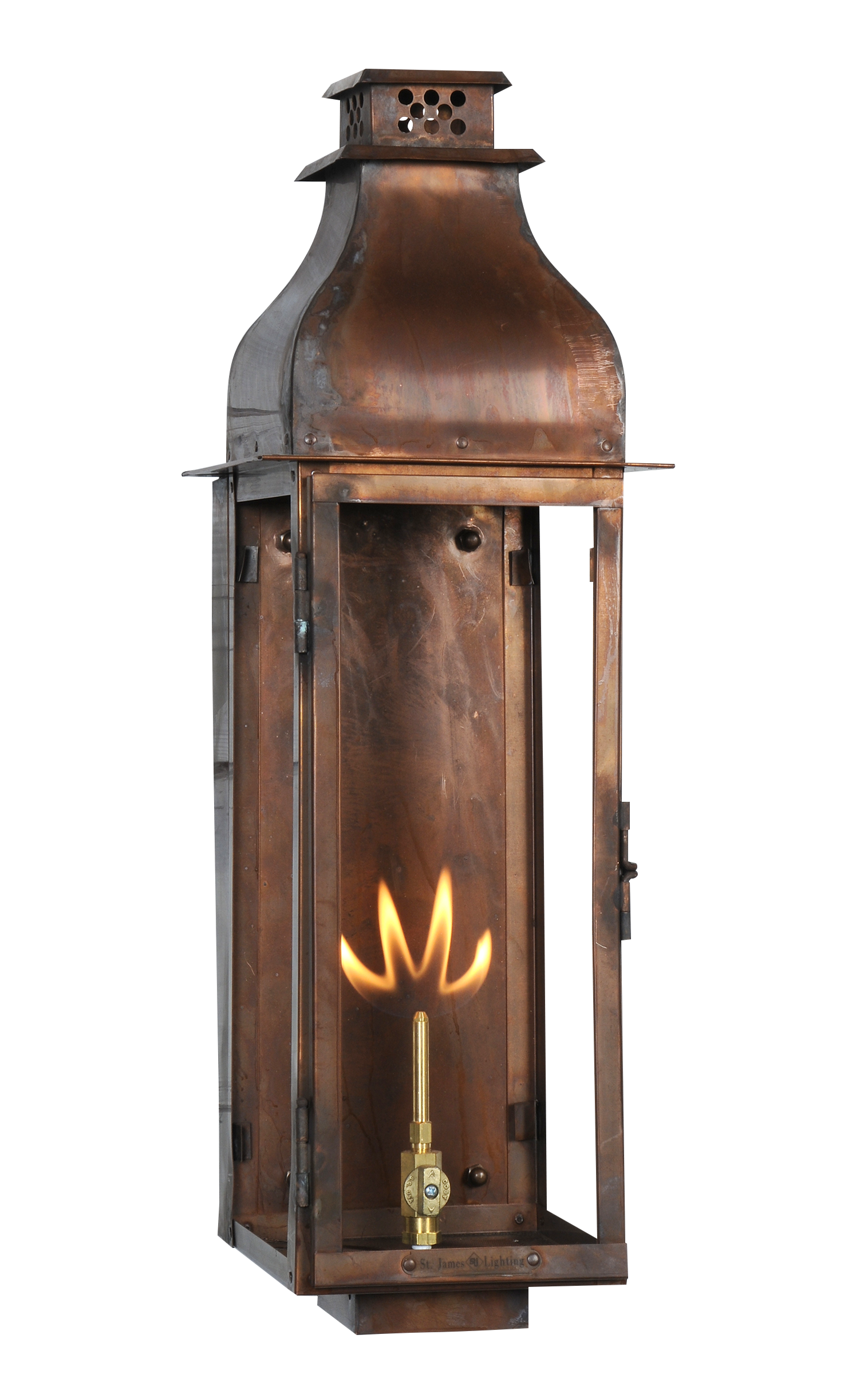 Hand-crafted copper gas lantern in the Sarasota style by St. James Lighting.